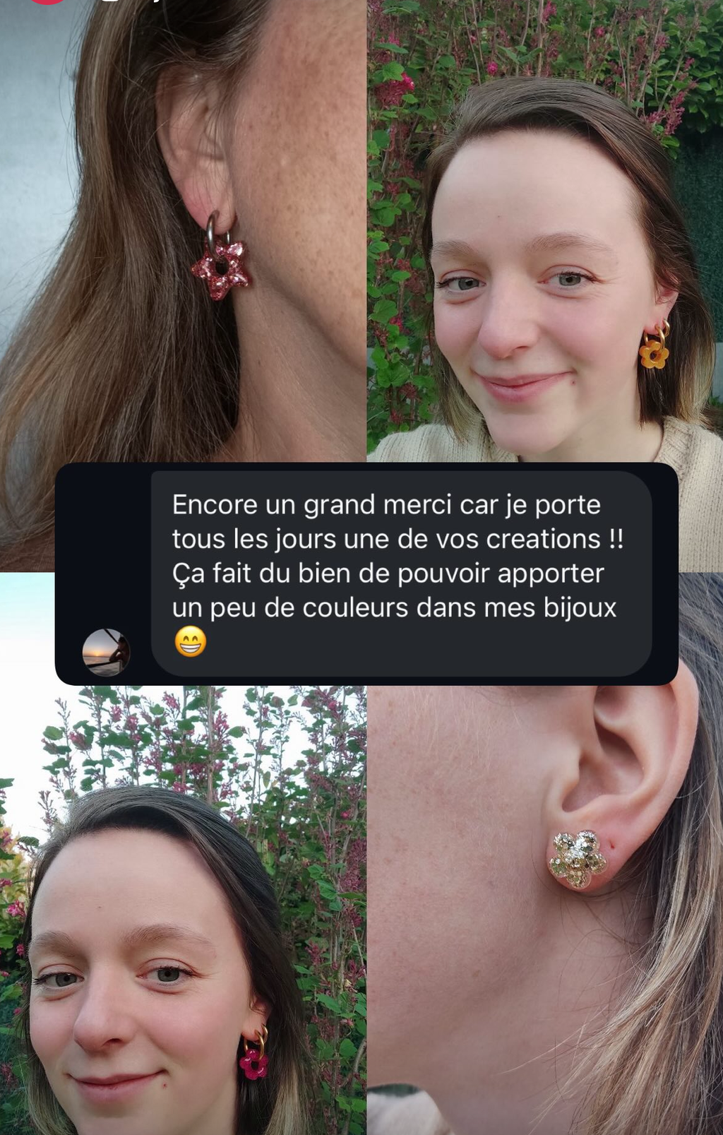 Rien ne me rend plus heureuse que de voir mes créations s'inviter dans votre quotidien. Que ce soit pour illuminer une tenue de fête ou pour apporter une touche de couleur à une journée ordinaire, vos photos et vos mots sont ma plus grande source de motivation.
